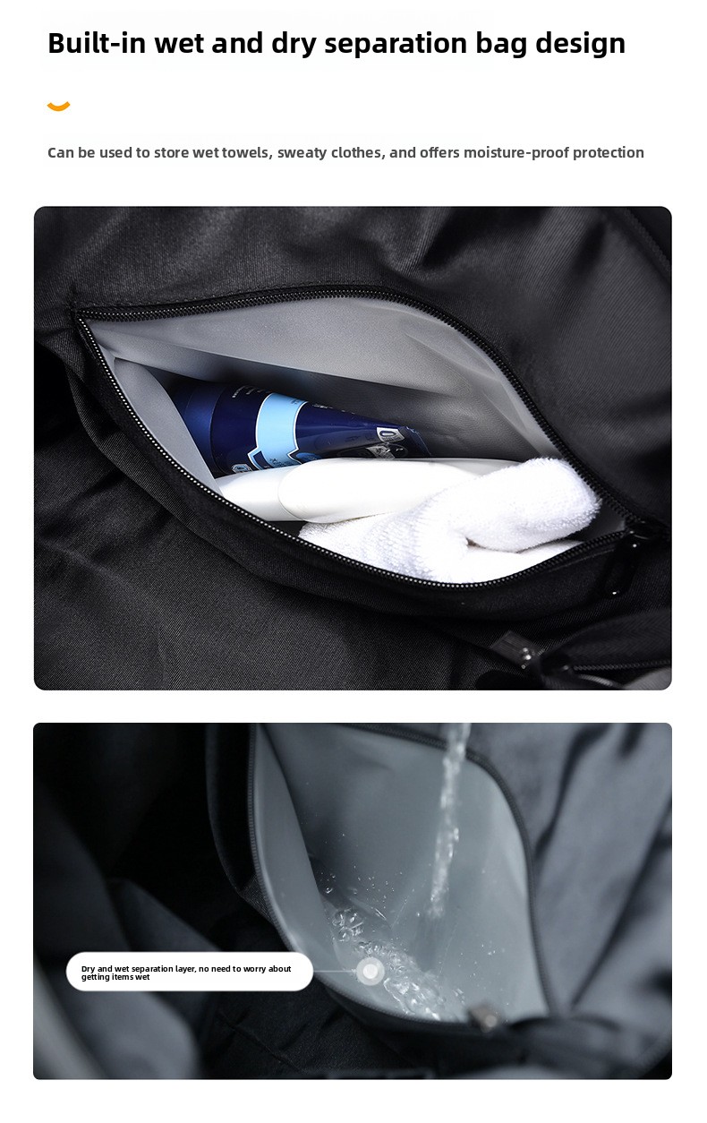 Dry/Wet Separation: Dedicated compartments for organized storage of wet and dry items.